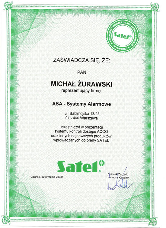 Certyfikat ZAKŁADU ELEKTRONIKI COMPAS,